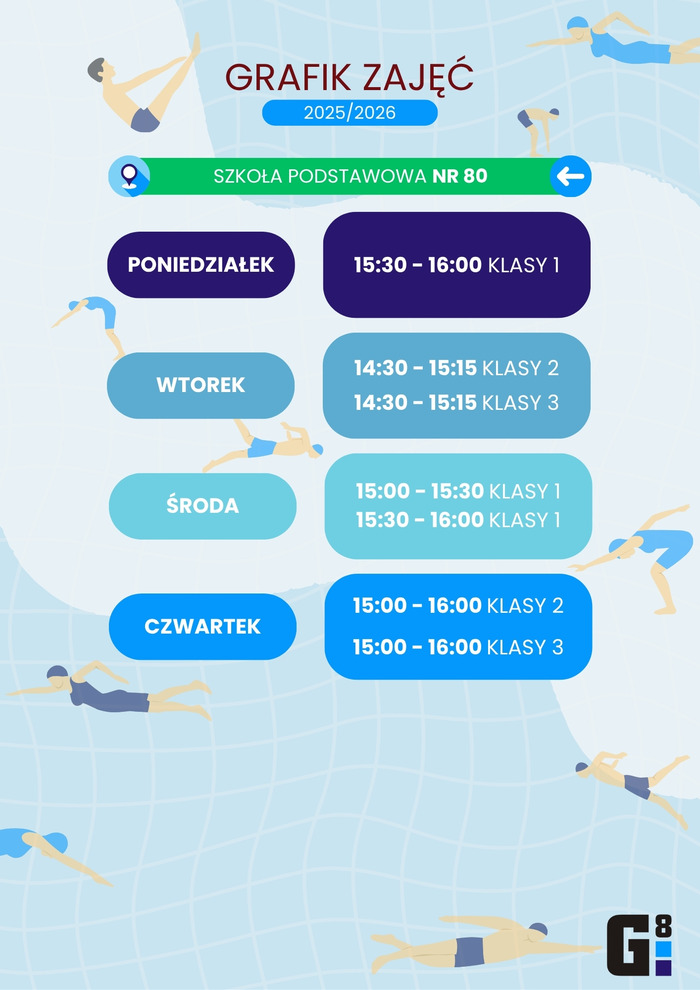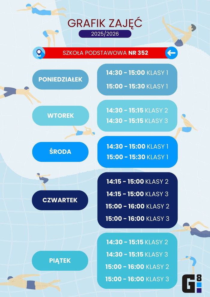 Odrabianie nieobecności dla ww grup, odbywać się będą w soboty w godz. 8.45-9.30, na pływalni przy ul. Conrada 6, począwszy od dnia 4 października 2025, z wyjątkiem okresu ferii bożonarodzeniowych, ferii zimowych, ferii wielkanocnych oraz dni wolnych, wymienionych w regulaminie zajęć.