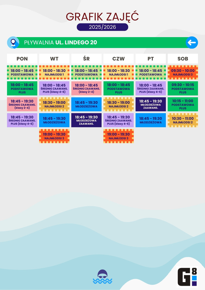 Odrabianie nieobecności dla ww grup, odbywać się będą w soboty w godz. 8.45-9.30, na pływalni przy ul. Conrada 6, począwszy od dnia 4 października 2025, z wyjątkiem okresu ferii bożonarodzeniowych, ferii zimowych, ferii wielkanocnych oraz dni wolnych, wymienionych w regulaminie zajęć.